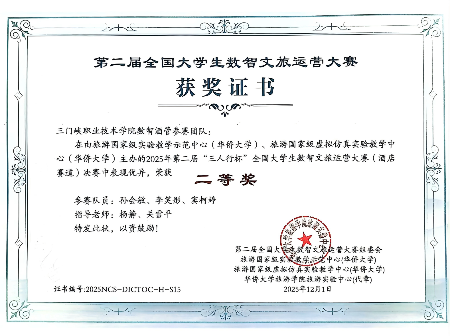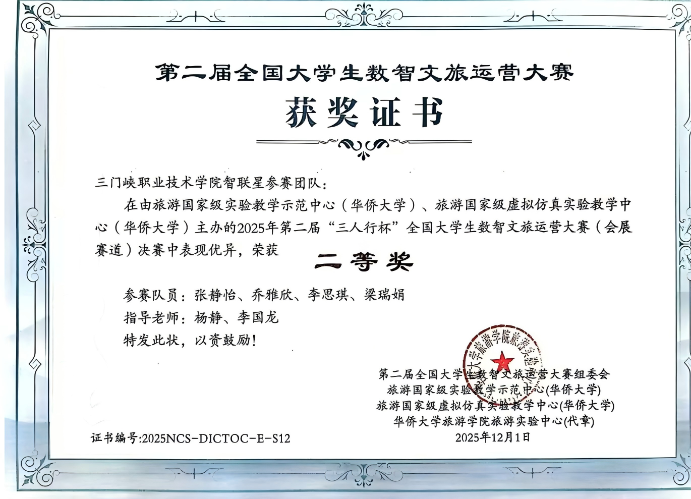 此次获奖是新的起点,更是新的激励。未来,学院将以此为契机,进一步深化育人模式创新,持续强化数智文旅相关领域的教学与实践资源建设,为学子们搭建更广阔的成长舞台,激励更多青年学子勇于挑战自我、追求卓越,在文旅行业高质量发展的浪潮中绽放青春光彩,为行业发展贡献更多 “三职智慧” 与青春力量。