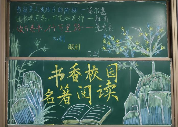 比赛过程中,各班学子充分发挥创意与巧思,围绕“名著推荐”“阅读心得”“读书故事讲述”三大核心内容展开创作。笔下文字或点评经典名著的深刻内涵,或分享个人阅读时的感悟共鸣,或讲述与书籍相伴的温暖故事;搭配协调的色彩、精致的插画,让一块块黑板报成为传递阅读力量的生动载体,营造出浓厚的班级读书氛围。